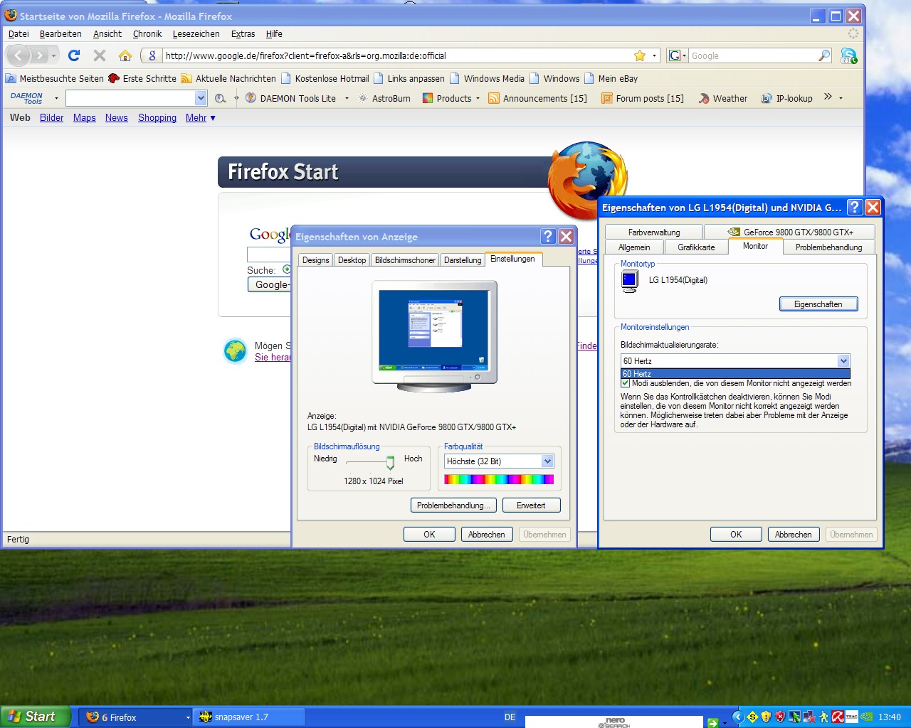 ich hab mir ein neuen LG L1954TQ TFT Monitor gekauft. Ich würde gerne mein LG auf 75 hz und 1280 * 1024 einstellen. Doch das Problem ist das er mir in diese Einstellung über den Digital Eingang nur 60 hz anbietet, obwohl ich eine GForce 9800 GTX und auch den neusten LG Treiber installiert habe. Meine Frage daher ist die 75 hz Einstellung den generell über Digitaleingang (DVI)bei der Auflösung von 1280 * 1024 möglich. Wenn Ja bitte erklärt es mir was Ich dann falsch mache. Ich hänge mal ein Bild an, damit Ihr wisst was ich meine.