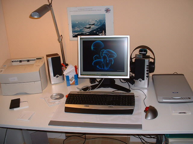 von mir umlackierten Trust Soundforce 1200 Lautsprechern, Logitech Trackmann Wheel, einem Epson Perfection 1670 Scanner und meinem bei Ebay ersteigerten Kyocera FS-800 s/w Laser.