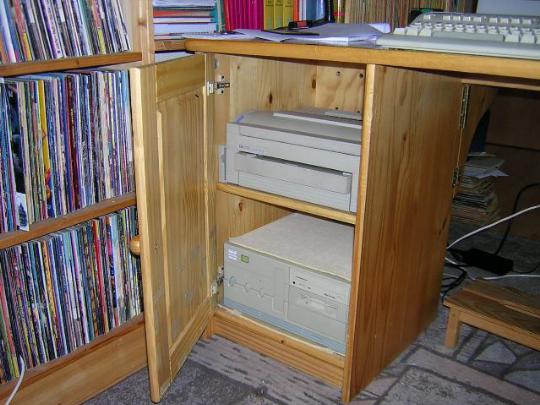 Das Besondere daran: Computer und Drucker sind komplett in der linken Schreibtischhälfte gebunkert.