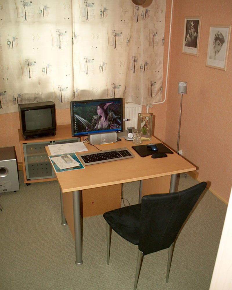 Also wenn du den Tisch auf die rechte Wandseite drehen würdest, dir noch ein kleines Regal ( mit einem Boden ) daranmontierst, müßtest du eigentlich keine Schwierigkeiten mehr haben.