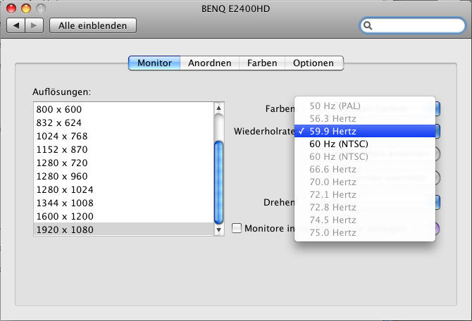 ich habe seit einer woche den BenQ E2400HD über HDMI an meinem MacPro (GFX=ATI Radeon HD 2600 XT) angeschlossen. Leider kann ich keine 50 Hz unter FullHD Auflösung anwählen --> siehe Anhang. Desweiteren kann ich genauso wenig die Sharpness im OSD Menü verstellen.