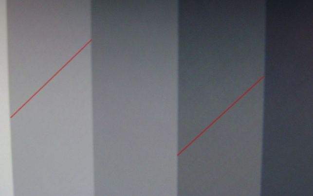 Ich füge noch zwei Bilder, die ich vom Eizo Monitor Test gemacht hab, an. Sind leider nicht so gut geworden, aber ich hoffe man kann dennoch erkennen, was ich meine. Die roten Markierungen hab ich eingefügt, damit man den Verlauf der Streifen nachvollziehen kann.