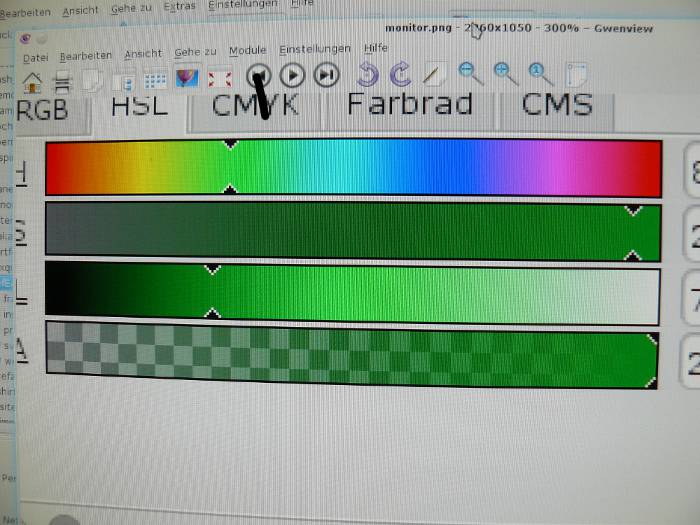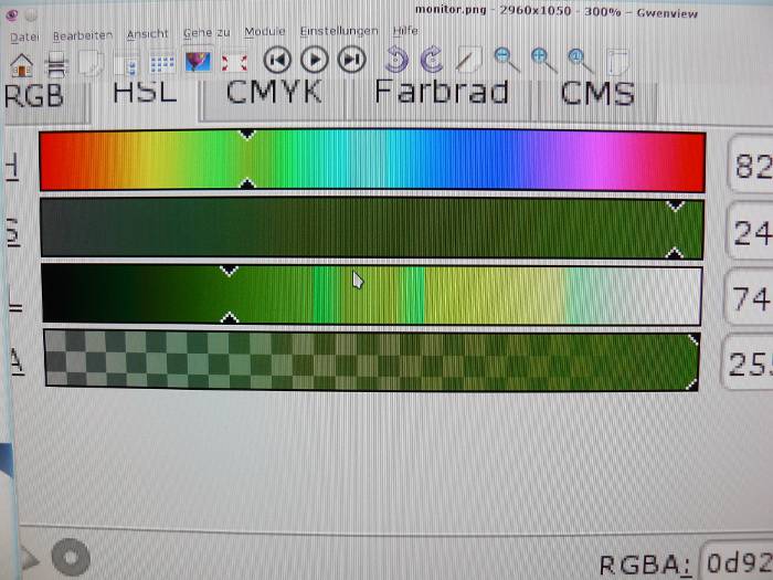 Schaut Euch mal den Grünverlauf im Farbmenü von Inkscape auf den Fotos an. Der P221W stellt diesen ganz mies dar, mit grellen grünen fast homogenen Streifen, wohingehen mein alter P19-2 (den ich sogar schon durch neue Elektrolytkondensatoren repariert habe, aufgrund eines starken Gelbstiches) einen ordentlichen Verlauf von weiß-grün-schwarz darstellt. Im Blau-Bereich treten ähnliche Fehler auf mit stark grellen Cyan-Bereichen.