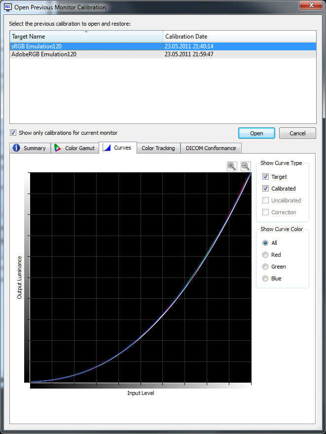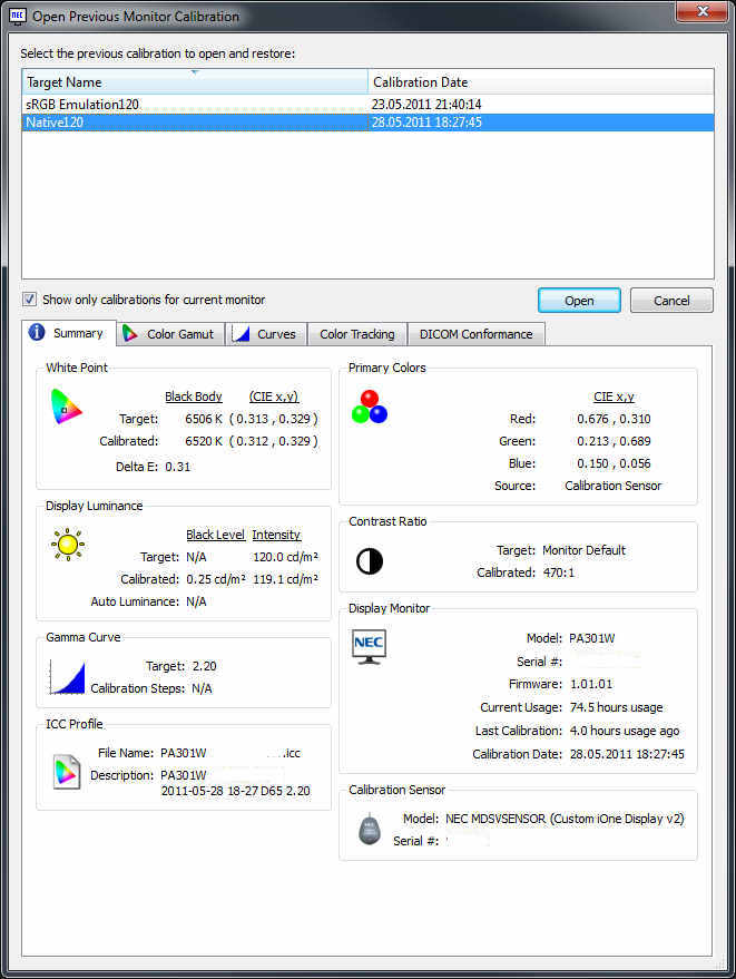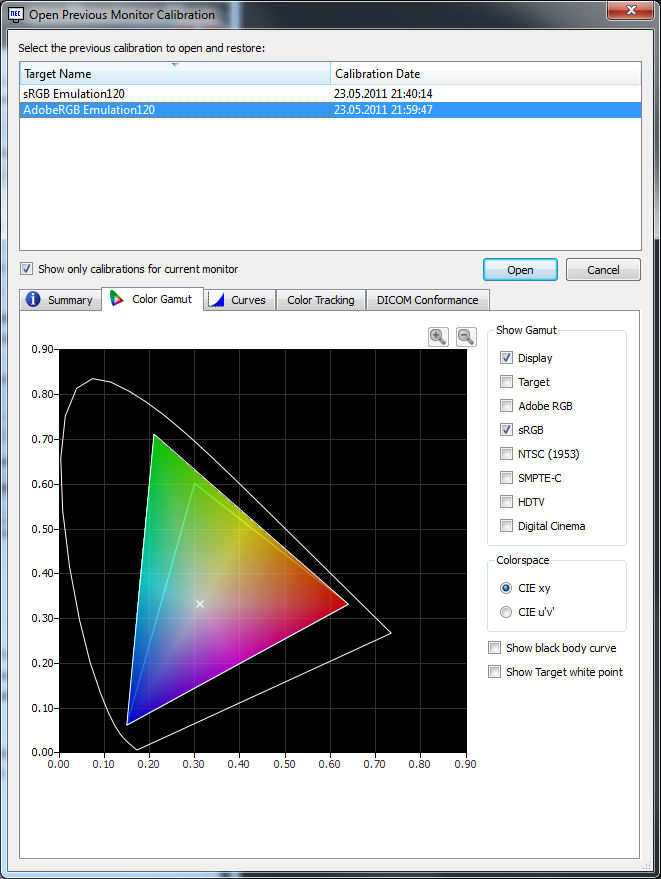 • Ich habe mit dem NEC MDSV2 Sensor (EOD2) und Spectraview2 jeweils ein Target für sRGB und AdobeRGB kalibriert.