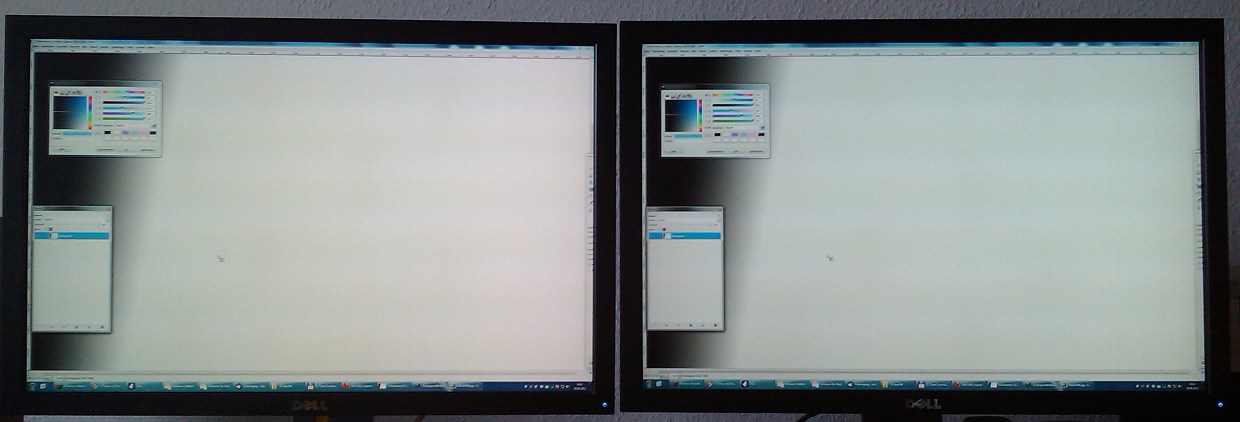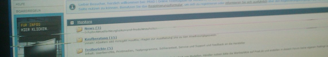 Dieses Ding hat mehrere Defekte: Ziemlich schnell (also nach wenigen Monaten) haben nach dem Einschalten einzelne Zeilen geflackert, aber nur auf der linken Bildhälfte. Dieses Flackern schien vor allem an ganz sanften Farbverläufen zu entstehen. Das Flackern entsteht häufig zwischen 5 - 30 min nach dem Einschalten. Durch Aus- und wieder Anschalten ließ sich das vorübergehend beheben. Hartnäckige kaputte Zeilen, zum Beispiel an einem Logo meiner Lieblingsinternetseite (beim Scrollen ist das Flackern entsprechend mitgescrollt), waren manche Tage auch gar nicht wegzukriegen. Das trat fast täglich auf.