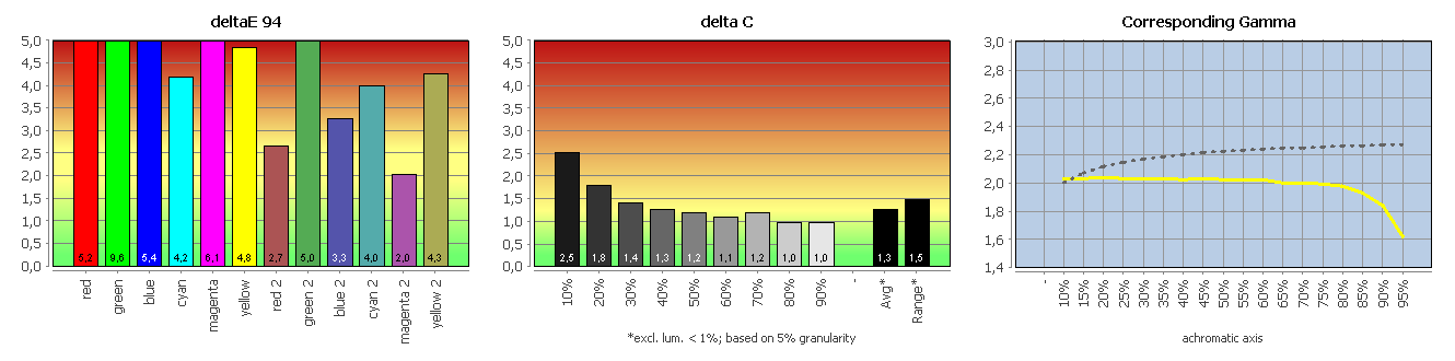 Es ist auffällig, dass kein Monitor eine schlechtere Farbabweichung in deltaE 94 von 5,o hat.