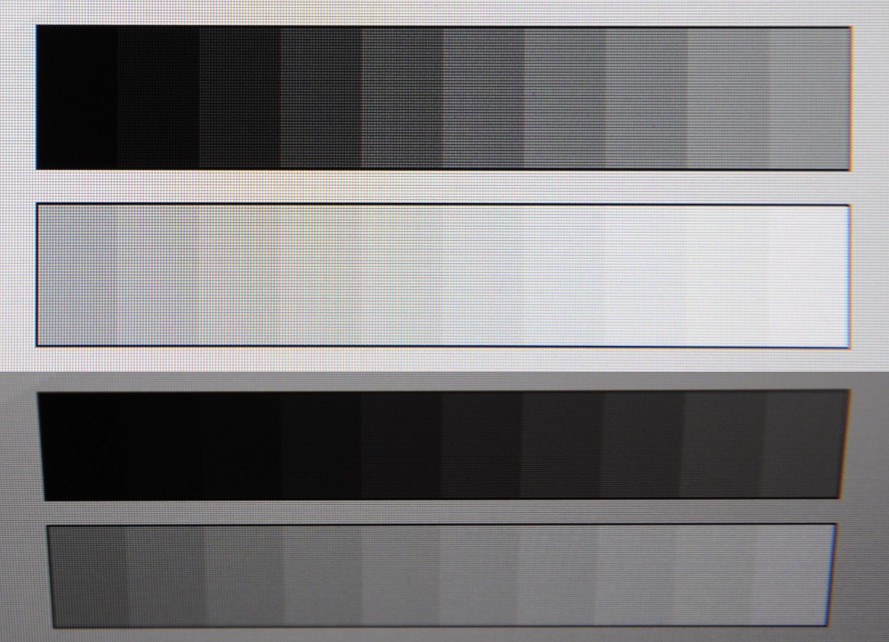 Ich glaube aber das Problem gefunden zu haben: Ich denke es liegt am Winkel. Besonders aufgefallen ist es mir bei Dock und Taskleiste und die befinden sich unten am Bildschirmrand, deshalb muss man nach unten sehen und hat keinen geraden Betrachtungswinkel. Ich habe mal ein paar Fotos gemacht, einmal Graustufen erst gerade und dann von oben und dann noch meinen unteren Bildschirmrand bei verschiedenen Helligkeiten und Gammawerten, einmal von vorn und einmal von oben. Ich glaube der Unterschied wird deutlich, auch wenn die Bilder freihand gemacht sind und keinen Anspruch auf Schönheit oder technische Korrektheit erheben. Ist das normal bei IPS? Bei diesem Modell? Hier im Test wird dem Monitor ja an sich eine recht gute Blickwinkelstabilität bescheinigt, was ja auch einer der Vorteile von IPS ist , deshalb wundert mich das ein wenig.