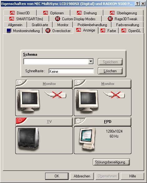 Bei meinen vielen Einstellungsversuchen ist mir noch folgendes aufgefallen, was vielleicht nicht ganz unerheblich sein könnte. In den Grakaeinstellungen unter Erweitert und dann Anzeige, kann man ja zwischen 4 Anzeigeoptionen auswählen (Monitor, TV, YPbPr und FPD). Letzteres ist ja ein Flachbildschirm. Nur leider kann ich da diese Option nicht anwählen. Das heisst also, dass das TFT über die Monitoroption läuft. Ist das vielleicht entscheidend ?