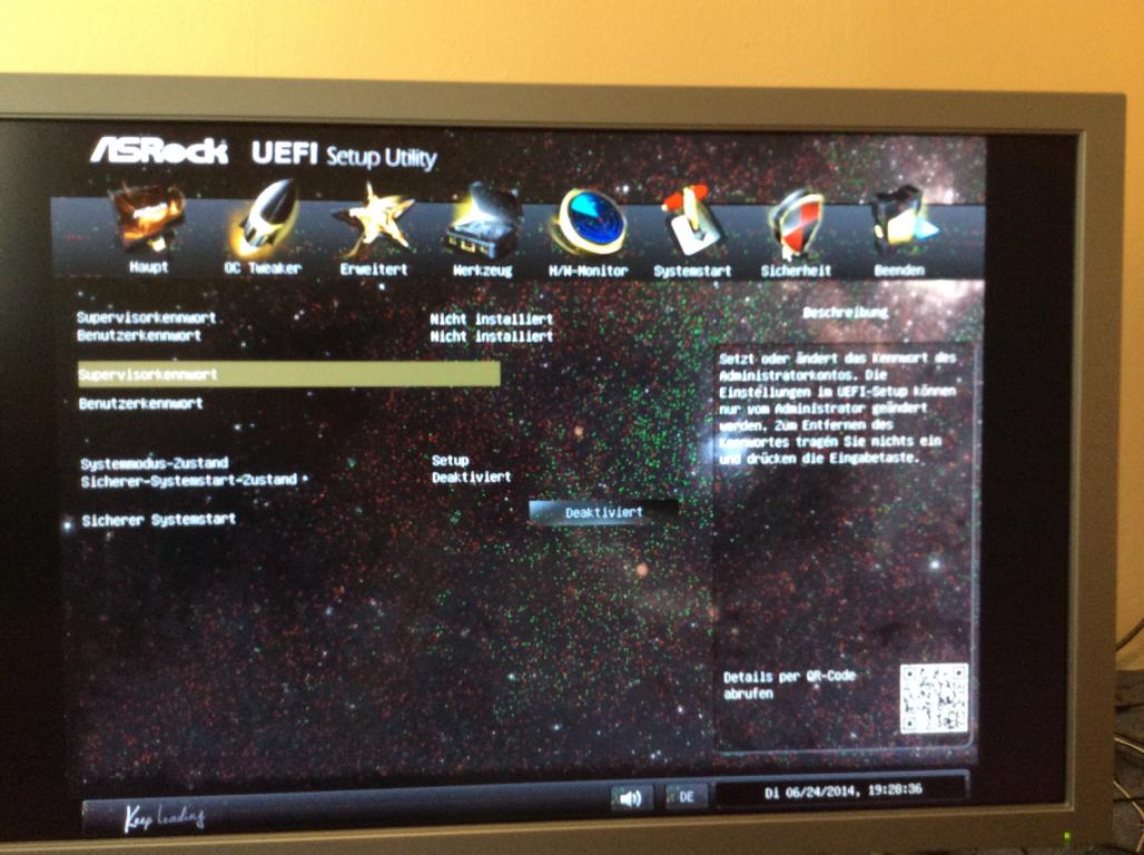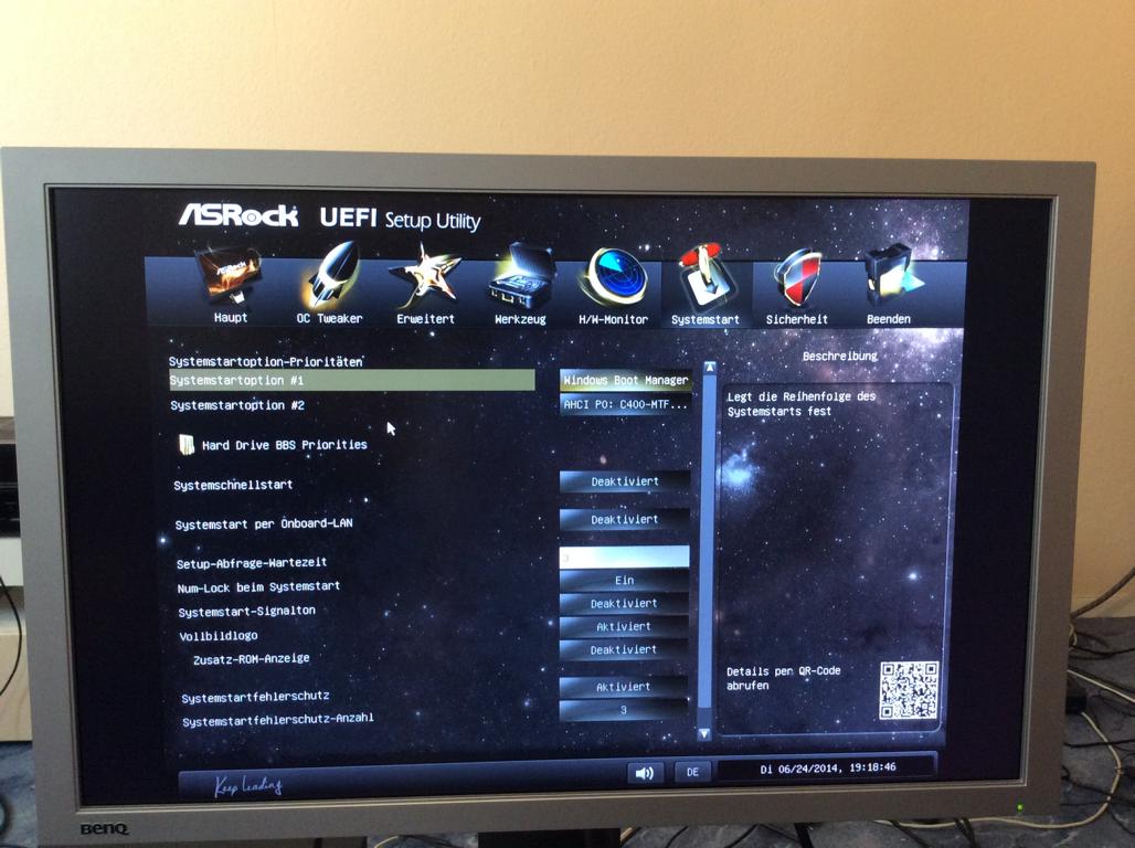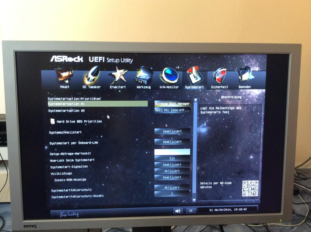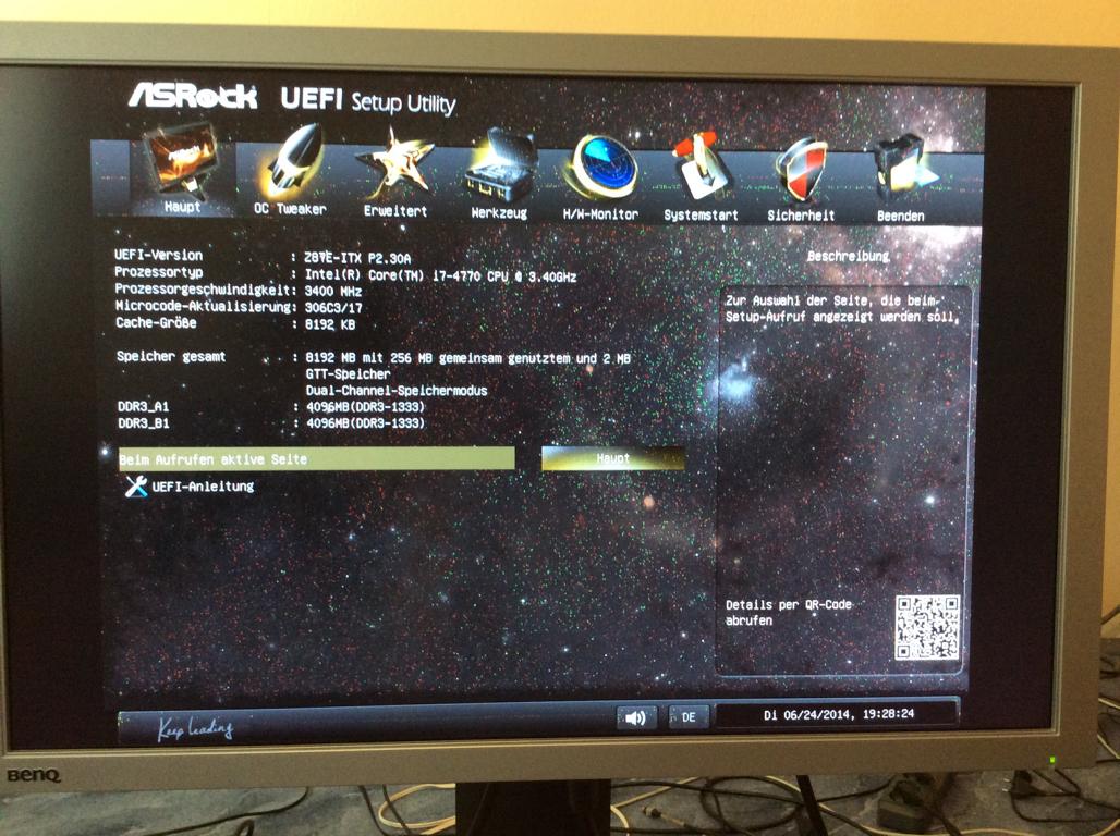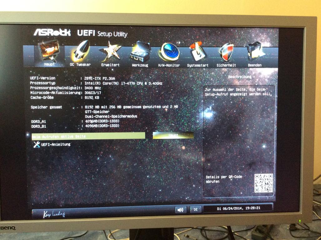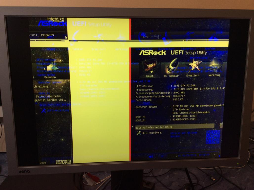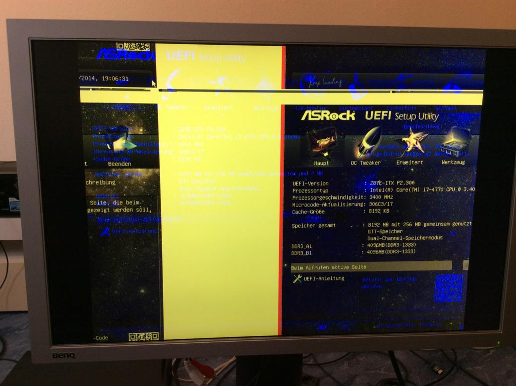 Danach habe ich nochmal DVI Kabel angesteckt und mal umgedreht am PC probiert. Auf einmal kam EFI (Asrock Z87e ITX) zwar mit gelben Balken und ohne Farbe aber man sah was. Nochmal am DVI Kabel rumgemacht und dann kam EFI auf einmal in Farbe ohne gelbe Balken, allerdings sah man leichtes Rauschen auf ganzem Bild im EFI. Ich konnte jetzt Windows booten, man sieht den drehenden Kreis , sobald aber Windows GUI erscheinen will kommt kein Bild mehr, man sieht nur schwarz und BenQ ist aber noch an und leuchtet grün.