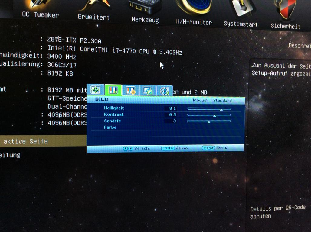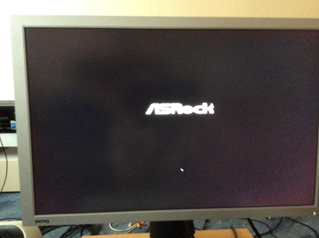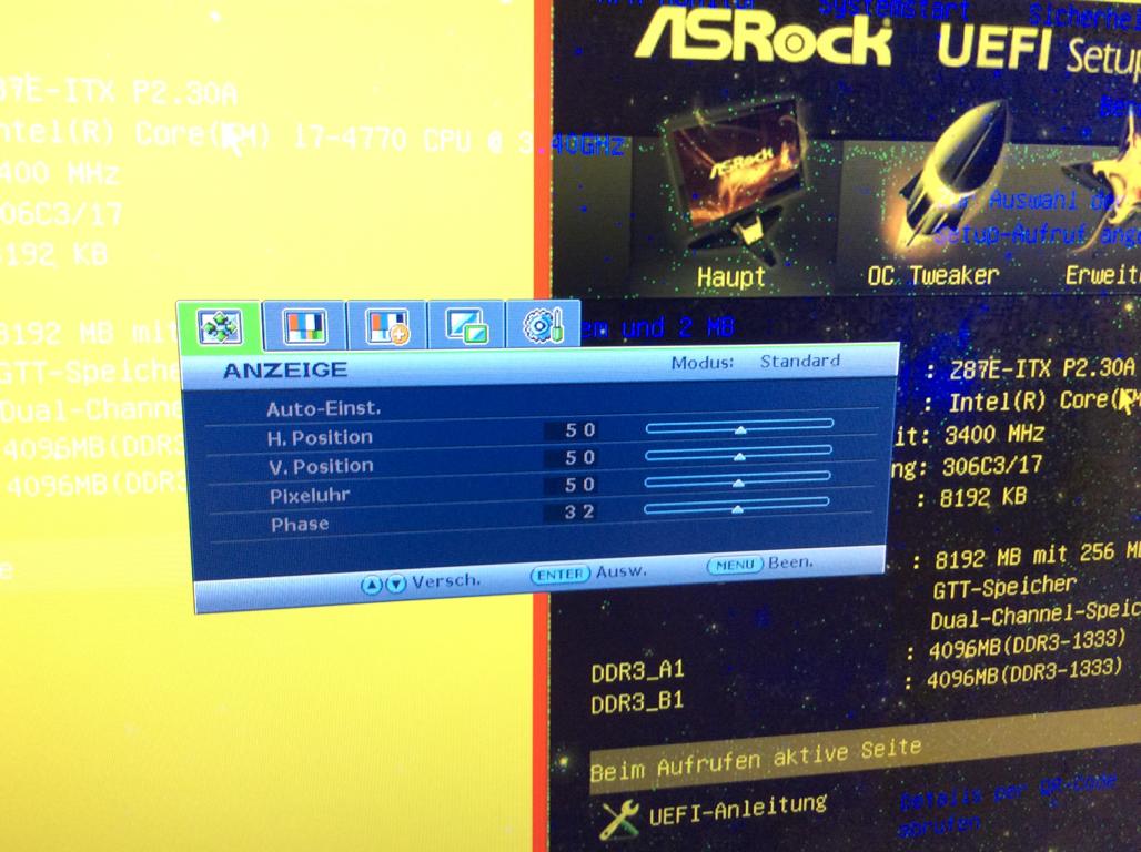 • Noch paar Bilder als Bild über DVI ging - noch ohne Adapter. Man sieht Rauschen im EFI bei einem Bild. Booten von Windows 8.1 sieht man Asrock und den Kreis, danach schwarzes Bildschirm mit grüner LED. Ich habe an meinem ITX PC keine Grafikkarte zur Zeit.