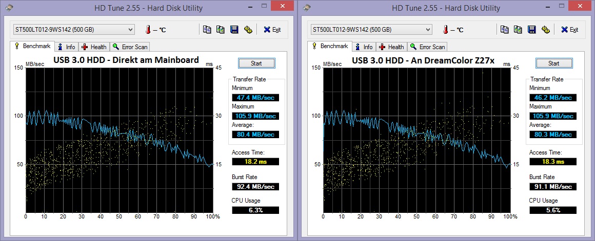 Was die Sache mit dem USB 3.0 Port angeht: Ich habe am Monitor (immer an den Ports links am Bildschirm) inzwischen einen USB 3.0 USB Stick, eine USB 3.0 Festplatte und auch noch eine alte USB 2.0 Festplatte getestet. Alle samt liefen problemlos an und haben auch bei einem Schreib- & Lese Test keinerlei Probleme gemacht. Auch die Performance war ziemlich exakt die selbe wie direkt am Mainboard angeschlossen.