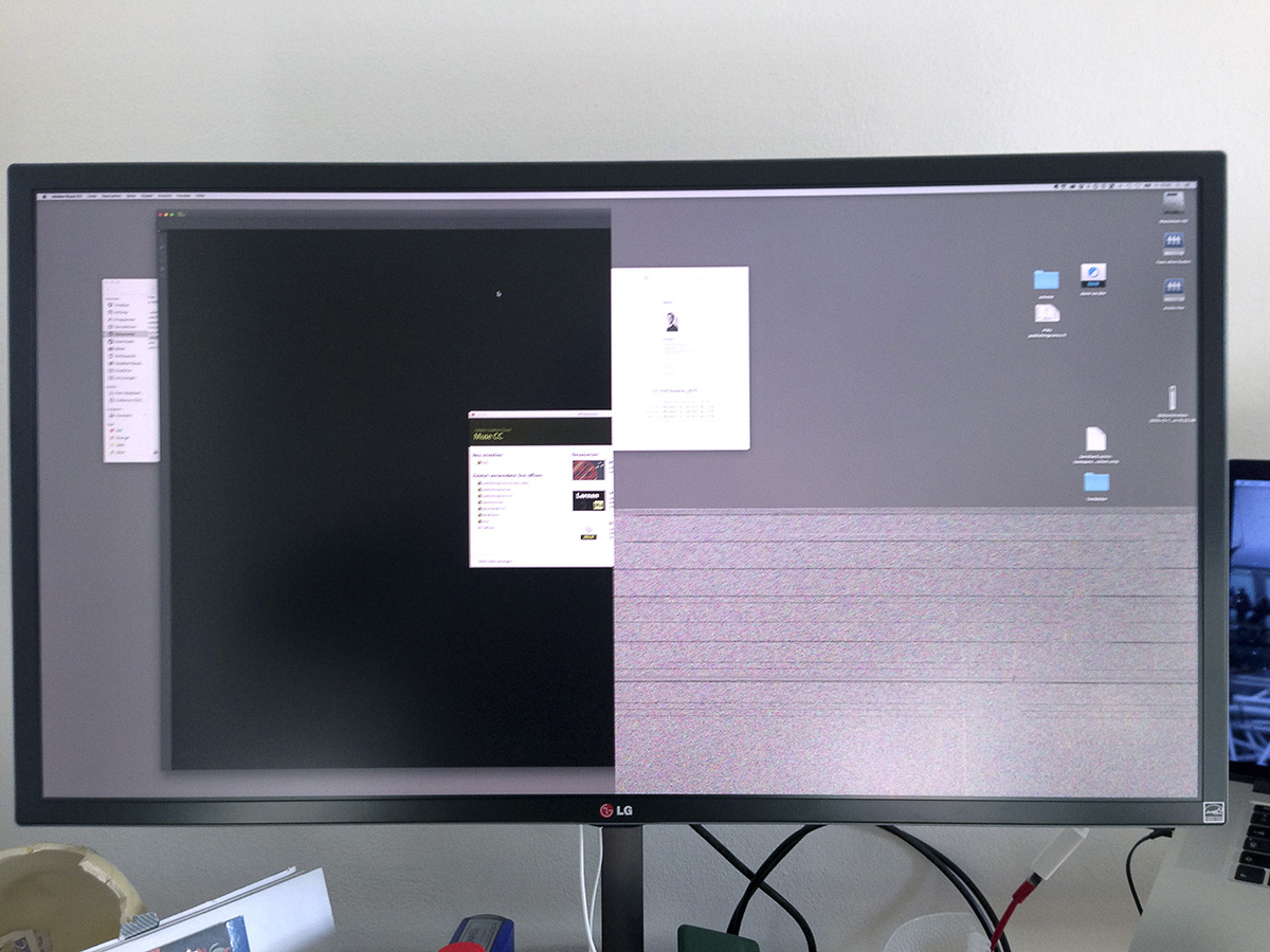 • Zusätzlich zu meinem vorigen Post würde mich interessieren ob es andere User gibt, denen die halbe Fläche des Monitors gelegentlich "einfriert" (siehe Bild)? Bei mir immer wieder und dann nur die rechte Hälfte wovon das untere Viertel "Griesl" wird. Angeschlossen an ein MacBook Pro via MiniDisplay Kabel, 4096 x 2160 @ 60 Hz. Gabs unter Yosemite auch schon gelegentlich... Bis jetzt keine Dual Controller oder Split Screen Software im Einsatz.