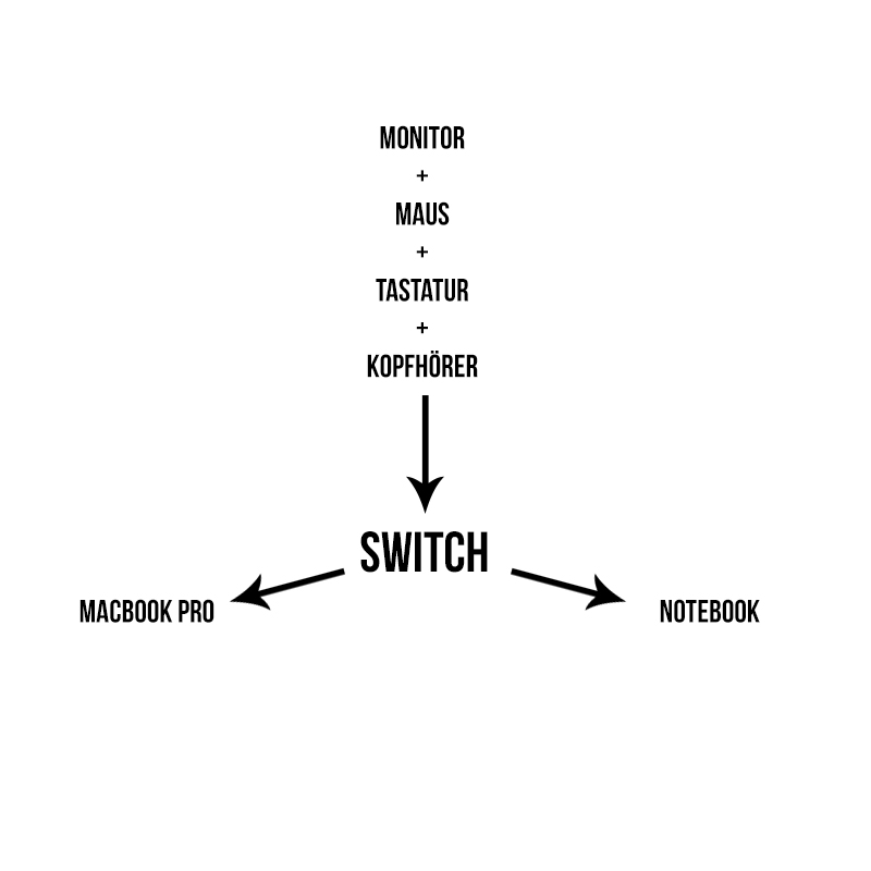 Ich suche nach einer Lösung, in der ich alle Geräte (Monitor, Maus, Tastatur, Kopfhörer) an einen Switch anschliessen kann und mit einem Klick die Geräte entweder zum Macbook oder zum Notebook umleiten kann.