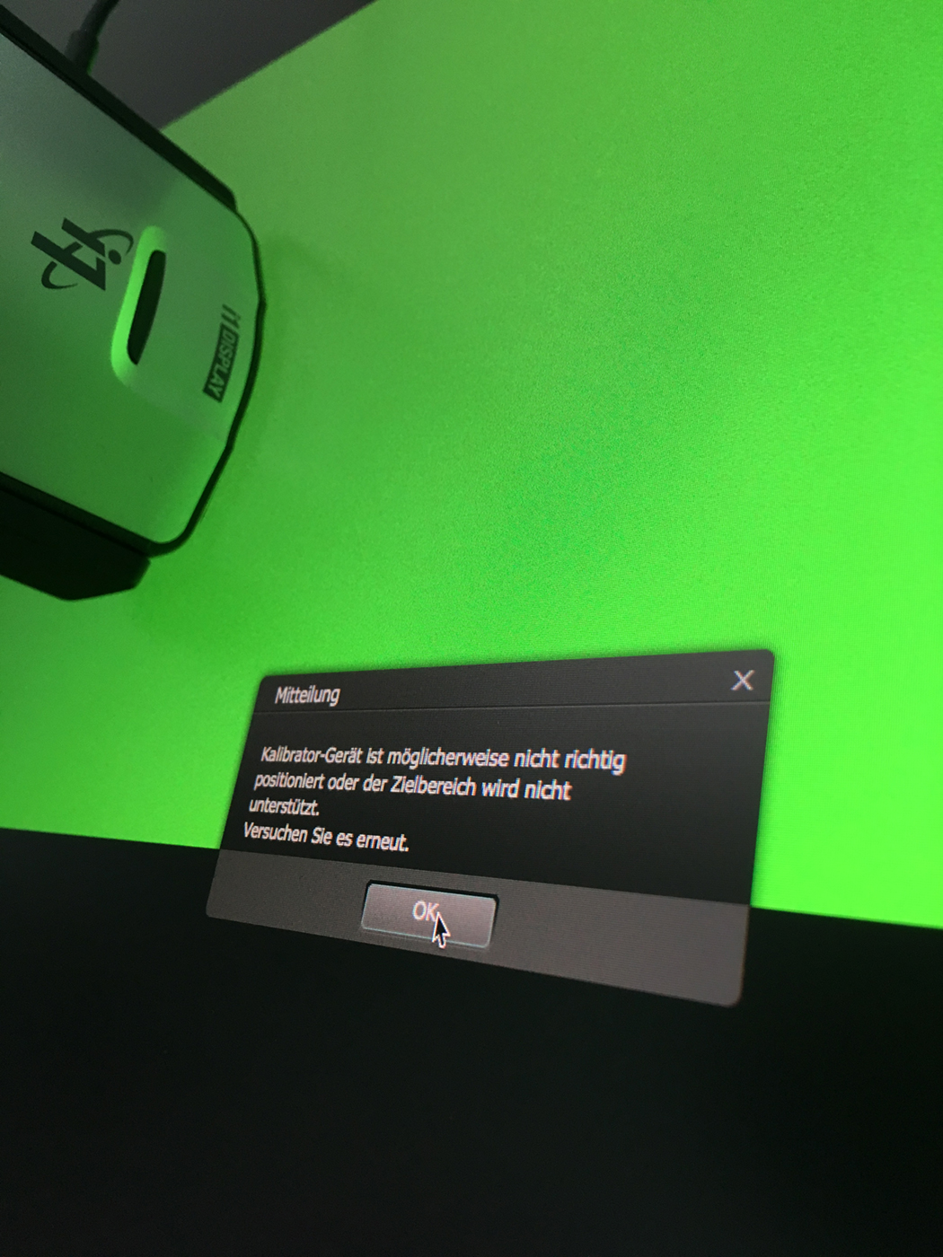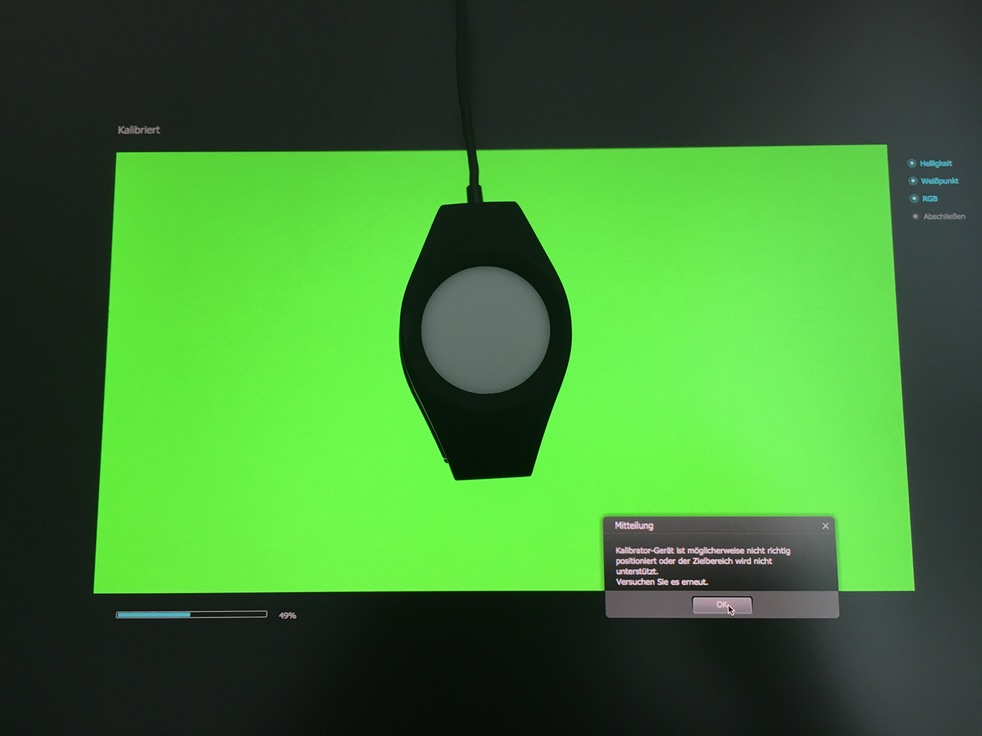 Ich habe jedoch das Problem, dass ich beim Kalibrierungsvorgang einen Fehler bekomme, sobald die Software bei "RGB" angelangt ist. Ich habe davon mal zwei Fotos angehangen.