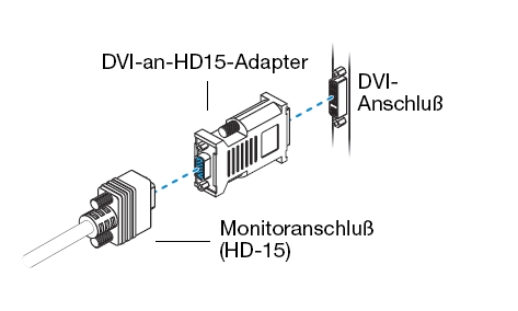 In der Praxis funktioniert es aber nicht: Ich habe einen anderen Monitor mit VGA-Eingang wie abgebildet angeschlossen. Leider kam aber kein Signal an. Ich glaube inzwischen, daß der D-Sub zu DVI-I Adapter die Schwachstelle ist.