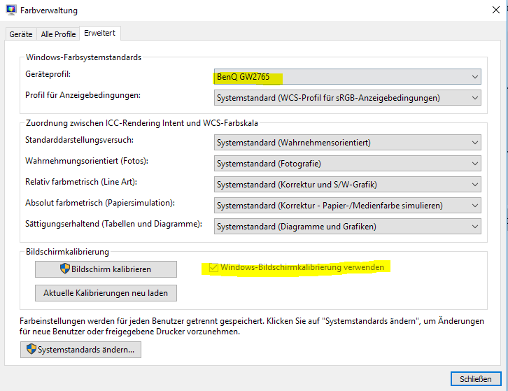 2. In der Farbverwaltung auf das Farbprofil umgestellt. (siehe screenshot.)