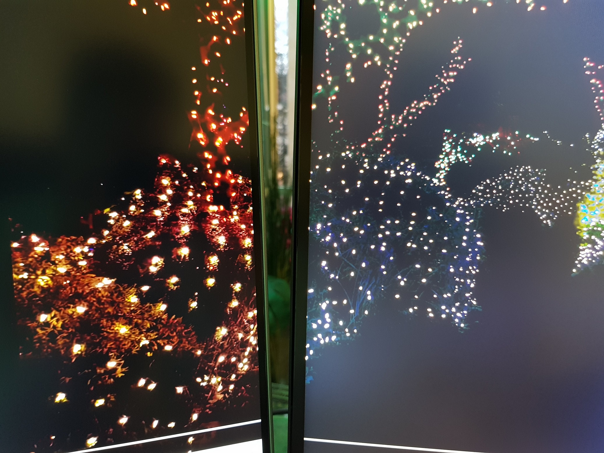 Ich habe einmal das Chrome-Fenster mit dem Video groß gezogen und über beide Monitor erstreckt, da sieht man links den alten Lenovo, rechts den neuen ASUS. Vielleicht bin ich von IPS auch nur verwöhnt, aber gefühlt verschluckt der Asus sämtliche Farben und Details, klar wird er sehr dunkel, aber dafür seh ich die Hälfte der Inhalte nicht mehr...