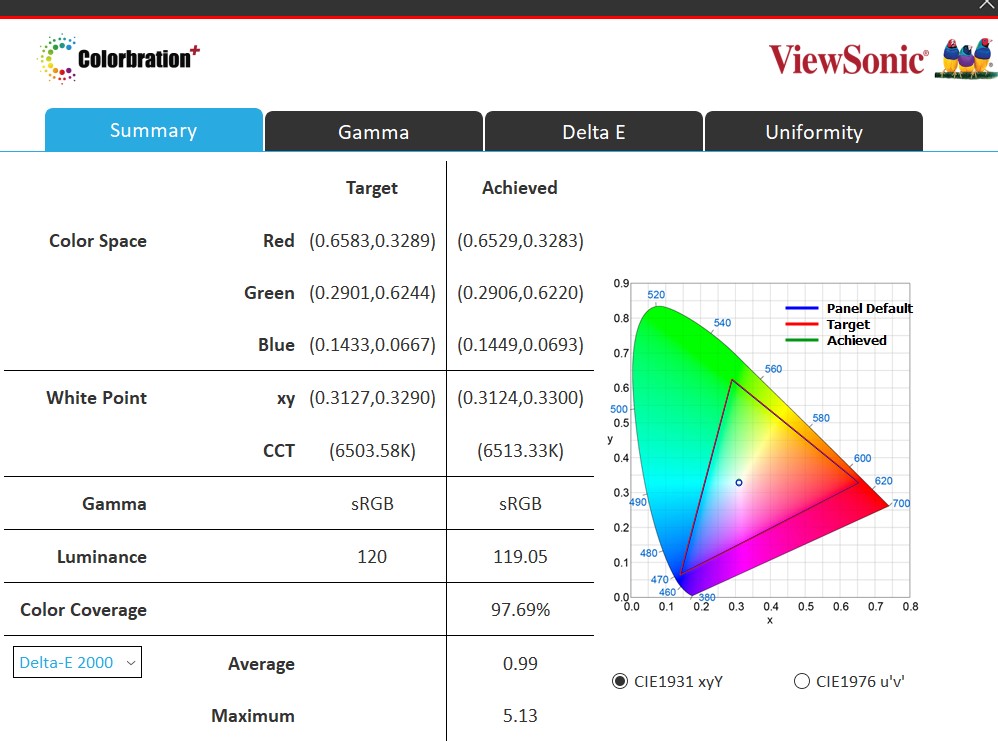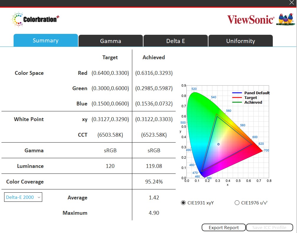 Mit den Zieleinstellungen Farbraum SRGB, D65, Luminanz 120, und SRGB-Gamma komme ich auf eine (enttäuschende) Abdeckung von 95 Prozent. Mit Luminanz von 160 wird es leicht besser.