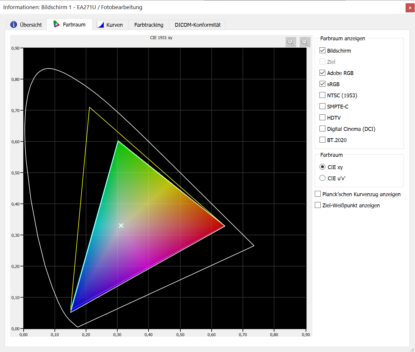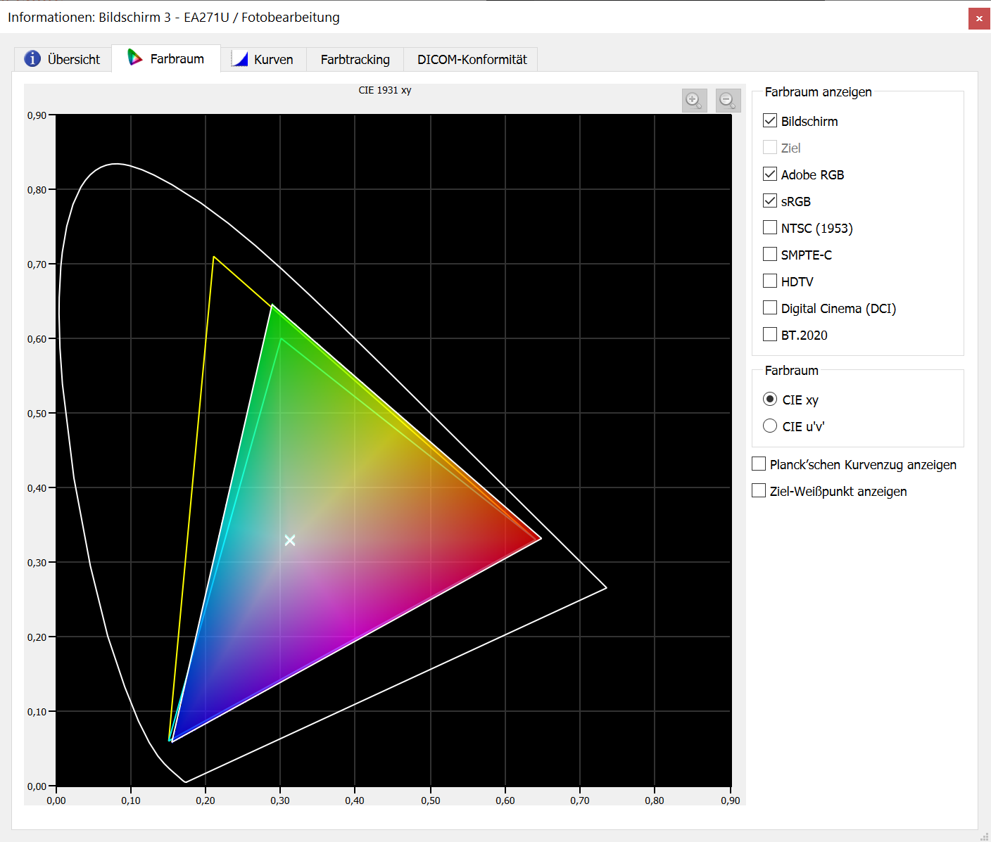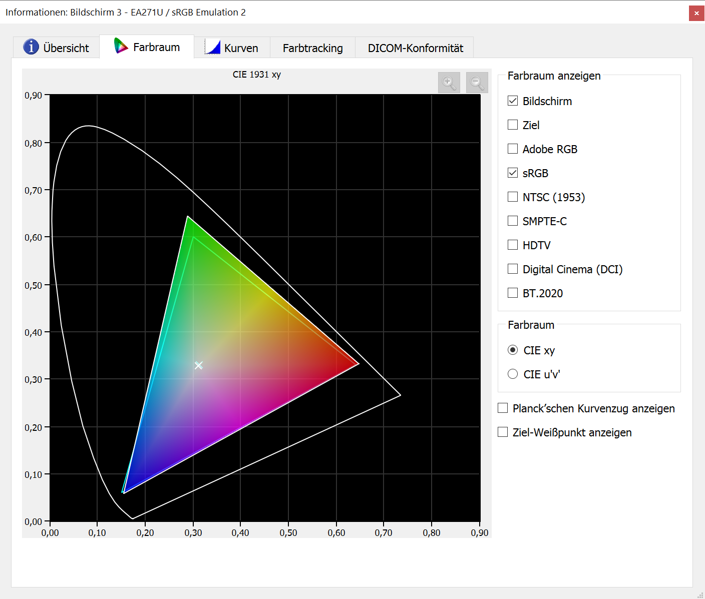 Panel 3: 1 Stunde Betrieb, Delta E 1.06 Avg / 1.31 Max, sRGB deutlich überabgedeckt (siehe Bild), Delta E mit dunklen Werten 1.23 Avg / 2.37 Max, Delta E am Weißpunkt 1.28