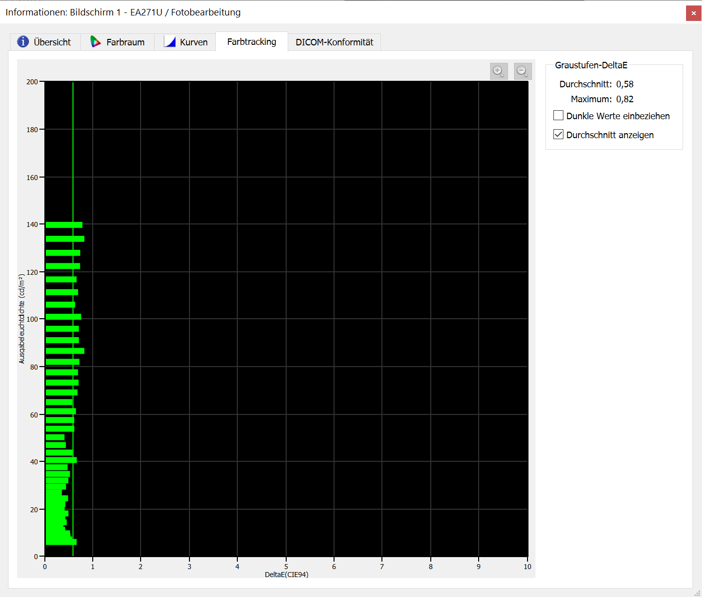 Panel 1: 6651 Stunden Betrieb, Delta E 0.58 Avg. / 0.82 Max, sRGB gerade so abgedeckt, Delta E mit dunklen Werten 0.84 Avg. / 2.18 Max, Delta E am Weißpunkt 0.78