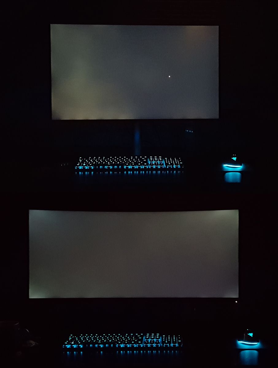 Ich habe hier zwei Fotos beigefügt. Erstens der problematische BenQ, und zweitens ein Dell 21:9 (750€). Beide Fotos wurden mit kurzer Belichtungszeit gemacht, möglichst mittig, aus 2m Entfernung (welche genügen sollte, um auch den IPS Glow zu minimieren).