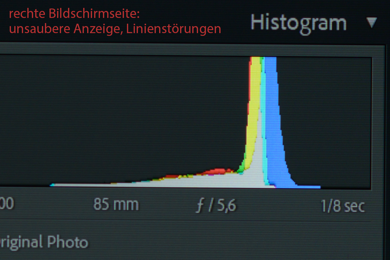 Hallo! Ich besitze einen 32" 4k BenQ Designer-Monitor (BenQ PD3220U), gerade mal ein halbes Jahr alt. Super Gerät, sehr zufrieden mit der Bildqualität. Allerdings habe ich in den letzten Wochen eine Art Zeilenbildung im Panel auf der rechten Seite beobachtet, die Anfangs nicht vorhanden war. Da scheint jede zweite Pixel-Zeile dunkler zu leuchten und es ist beim Arbeiten auffällig und störend.