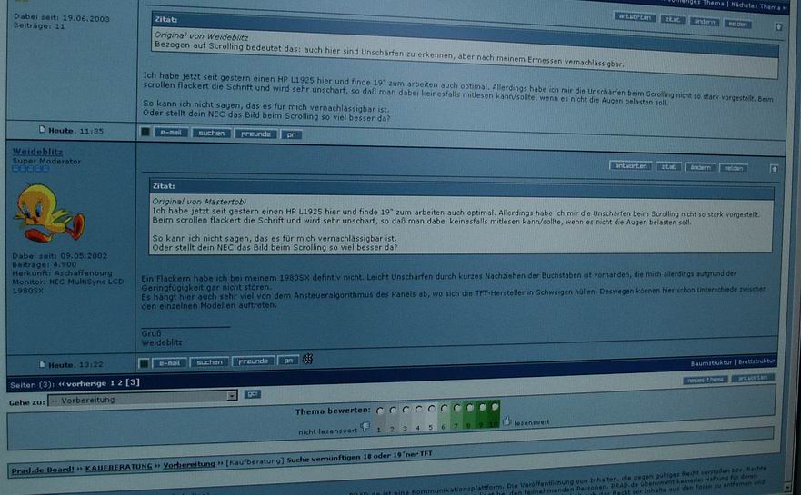 Ich hatte zuerst einen 18" NEC 1860 hier. Die Darstellung war mir ein wenig zu klein und außerdem gab es noch ein weiteres KO-Kriterium, daß der TFT strark brummte.