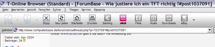 Doch, ich habe WinXP-Style. Nicht Windows klassisch. Mein T-Online-Browser sieht so aus... Die Unschärfe ist weg, die Pixeligkeit bei einigen Schriften ist noch da - die Schriften werden nicht geändert mit Cleartype, ich kann diese auch sonst nirgends ändern (Schriftart/Größe).