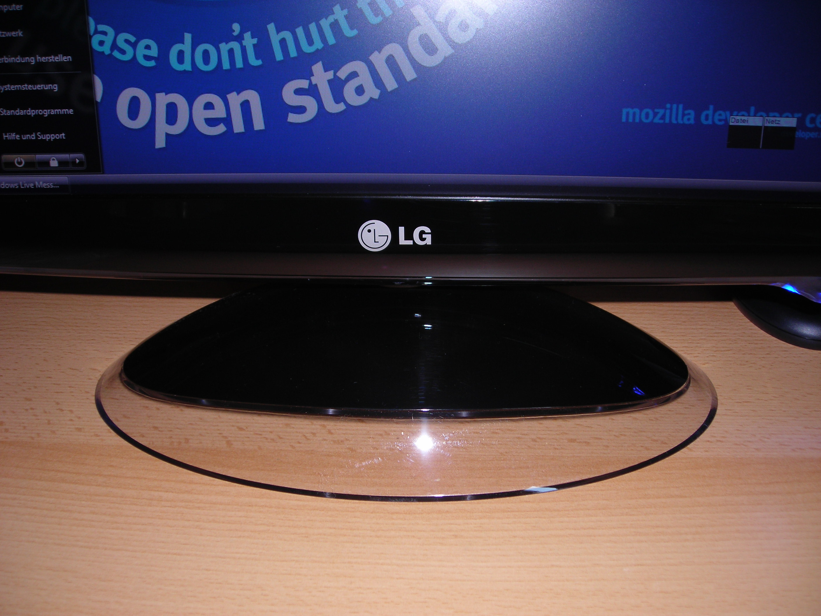 Im Standby, fängt diese an zu blinken, selbst wenn man die Lampe an sich ausgestellt hat. Im Fuss ist noch eine weisse LED versteckt. Sobald der Monitor im Standby ist, fängt diese auch langsam zu blinken an und somit ist der halbdurchsichtige Fuss beleuchtet.