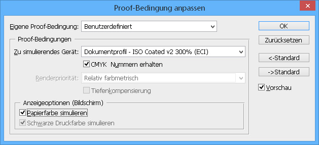 Es gibt beim Ablauf der Eizo Softproof-Validierung einige Fallstricke. Kontrolliere bitte die Einrichtung deiner Proofsimulation (siehe Bild). In Color Navigator auch die chromatische Adaption der Messwerte vom Monitorweißpunkt nach D50 aktivieren (wenngleich du ohnehin mit D50 kalibriert hast).ZitatIch bin nicht sicher, ob diese Frage richtig ist. Ist der Zweck des Kalibrierens überhaupt der, für die Emulation eines Druckprofils möglichst geeignete Einstellungen vorzunehmen? Oder nur der, den Monitor an Umgebungsbedingungen und, mit dem Weißpunkt, an die Papierfarbe anzupassen?