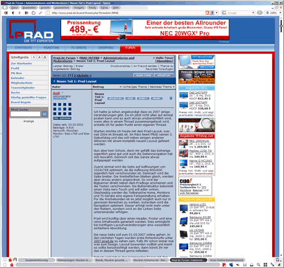 Ich habe mittlerweile herausgefunden, dass die dynamische Spaltenbreite im Opera immer dann Ärger macht (in der Breite komprimiert wird), wenn Scripting deaktiviert ist. Mit aktiviertem Scripting wird die Breite nur kurzzeitig komprimiert und dann sofort auf volle Fensterbreite vergrößert. Dadurch dass die Spalten erst komprimiert werden und danach vergrößert, ist der Seitenaufbau im Opera langsamer als in anderen Browsern. Beim alten Design ist das alles nicht passiert, an irgendwas scheint Opera sich zu verschlucken.