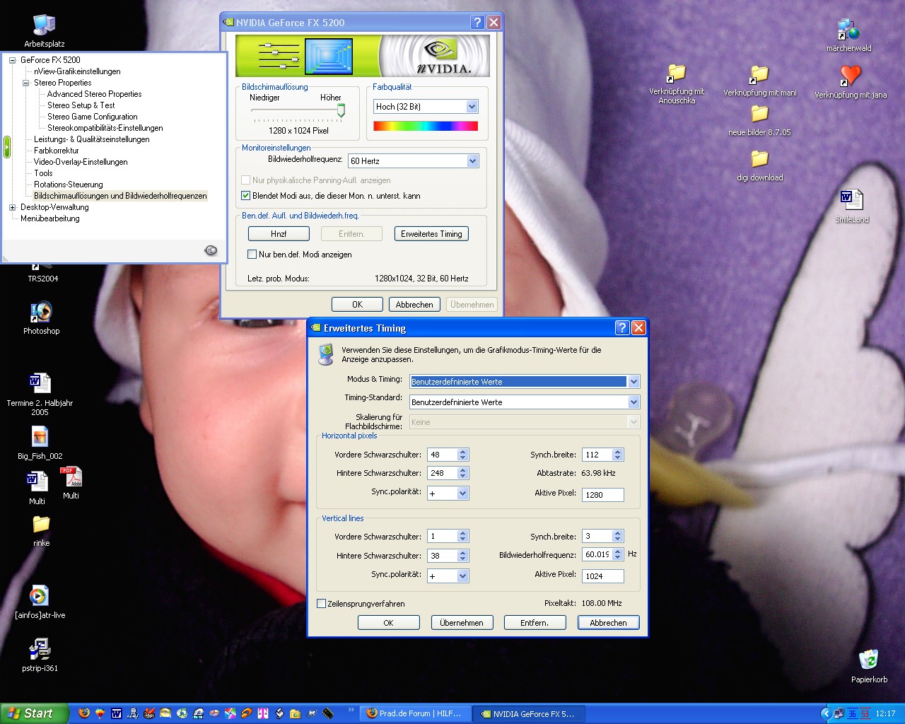 TFT 17" colortac LM17C neu gekauft. Ihn mit den Einstellungen 1024 x 768 60Hz angeschlossen, Bild nicht verschoben, aber Auflösung dann optimiert 1280 x 1024. Dann war das Bild verschoben (rechts und unten schmaler schwarzer Streifen, links und oben Bild abgeschnitten). Auto-adjust zentriert das Bild zwar, aber beim nächsten Booten und beim Gamen in anderer Auflösung wieder verschoben. Dann hab' ich noch mal die Röhre angeschlossen und sie auf 1280 x 1024 60Hz. eingestellt, TFT ran, Bild aber wieder verschoben. Auto-adjust jedesmal drücken geht zwar, aber optimal ist das natürlich nicht. Habs auch schon mal mit 75Hz probiert, same thing, und auch bei 1024 x 768 Umstellung inzwischen verschoben. Interessanterweise kann ich nach dem Booten auch mit der reset-Taste das Bild zentrieren, drücke ich danach auf auto-adjust ists verschoben. Ich steige da nicht mehr durch. Hat jemand einen heißen Tipp?