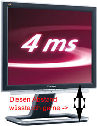 ich spiele mit dem Gedanken mri den ViewSonic VX924 zuzulegen. Jetzt habe ich gelesen, dass der nicht höhenverstellbar ist. Könnten mir die Besitzer eines solchen TFTs vielleicht den Gefallen tun und für mich den Abstand vom Tischfuss des TFTs bis zu Beginn des Bildschirms abmessen ? :). Aber hin- und herschwenken kann man den Bildschirm schon, oder geht das auch nich ?