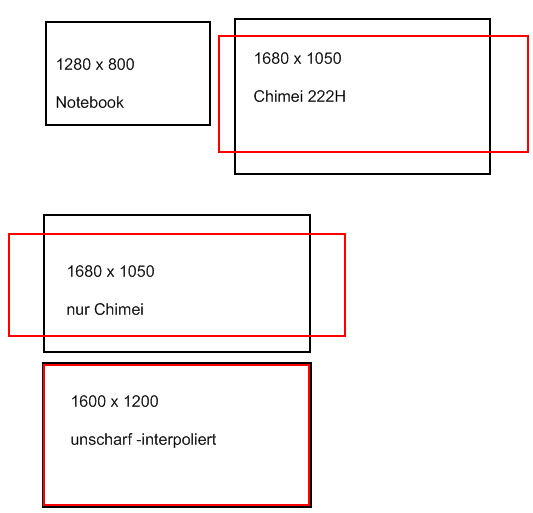 Das rote ist die Auflösung die angezeigt wird, und das schwarze ist der Monitorrahmen.