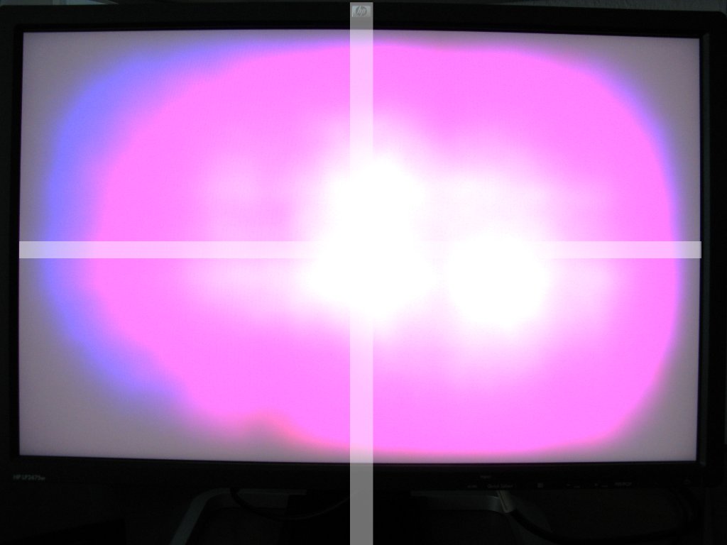 Jedenfalls habe ich (wenngleich mit schlechtem Weißabgleich seitens der Kamera, aber das soll jetzt mal egal sein), das Display wie gesagt fotografiert. Anschließend habe ich das Bild derart modifiziert, dass ich es einmal kopiert und als additive Ebene über das ursprüngliche Bild gelegt habe. Dann habe ich für diese Ebene Kontrast (hoch!) und Helligkeit (runter!) so verändert, dass die Ausleuchtung recht deutlich sichtbar wird. Die Mitte des Screens habe ich auch mal markiert, einfach zu Orientierungszwecken.