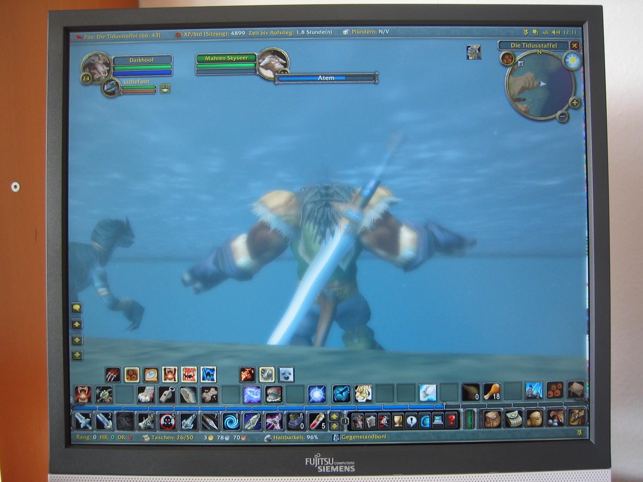 Ich bemerkte nun schon zum dritten Mal, nach etwa 1-2 Stunden in WOW in dunklen Räumen bzw. im Wasser folgende Erscheinung am rechten Bildrand. Von oben nach unten (oder umgekehrt) verläuft ein bunter Streifen. Dieser sieht je nach Hz-Zahl unterschiedlich aus. Lasse den Schirm auf 60Hz laufen. Habe mal Bilder angehängt. Werde auch mal mit dem Händler in Kontakt treten, denn das ist nicht wirklich schön bzw. so gewollt!Falls Ihr ähnliche Erfahrungen habt, oder das vielleicht normal ist, sagt mir bitte bescheid. Angeschlossen habe ich den Schirm per DVI, Grafikkarte ist eine 9800Pro256MB und habe auch den Treiber schon aktualisiert.