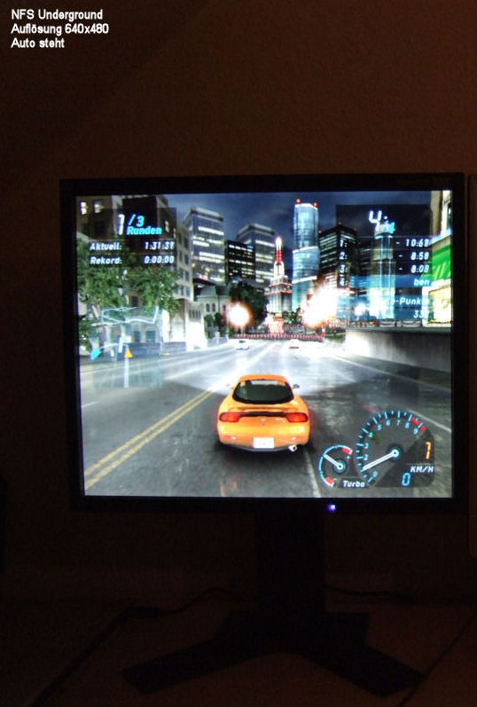 Wir haben NeedForSpeed Underground in allen möglichen niedrigeren Auflösungen am EIZO getestet. Da wir beide selbst normalerweise nur die höchste Auflösung nutzen und nie interpoliert spielen, wissen wir jetzt eigentlich nicht so recht wie eine 'gute' Interpolation' eigentlich auszusehen hat?!?