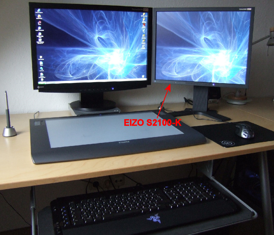 Ich verkaufe meinen geliebten EIZO S2100-K (21" im 4:3 Format, schwarz), da ich meinen Zweischirmbetrieb (siehe Bild im Anhang) wg. Umstiegs auf 30 Zoll auflöse.