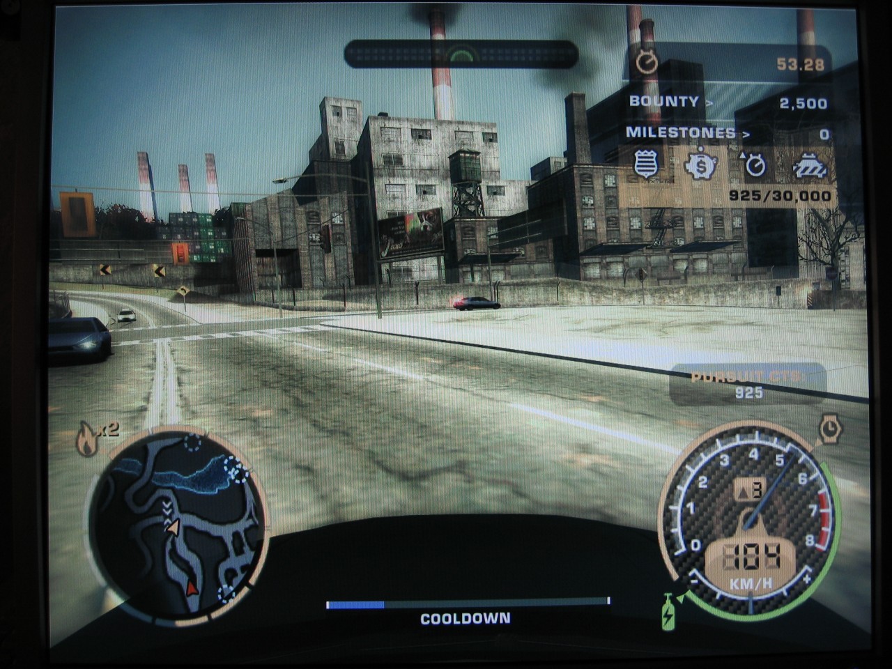 Hallo, anbei einige Screenshots. Da die DVI Grafikkartenschnittstelle am Wochenende den Geist aufgegeben hat, musste ich den Monitor an den Analogausgang anschließen, was die Bildqualität etwas verschlechtert hat. Die miese Fotoqualität bitte ich zu entschuldigen, aber eine Digicam ist nicht sehr gut zum Bildschirmabfotografieren geeignet. Daher auch die vertikalen Streifen, welche auf dem Monitor natürlich nicht zu sehen sind, die Farben sind leider auch nicht optimal wiedergegeben. Bezüglich der Bildschärfe kann man schon etwas mehr erkennen. Die Bilder sind von oben gesehen, dreimal STWBF2 und zweimal NFSMW und einmal schwarz mit Lichthöfen (etwas lange belichtet), zu mehr bin ich gestern abend nicht mehr gekommen.