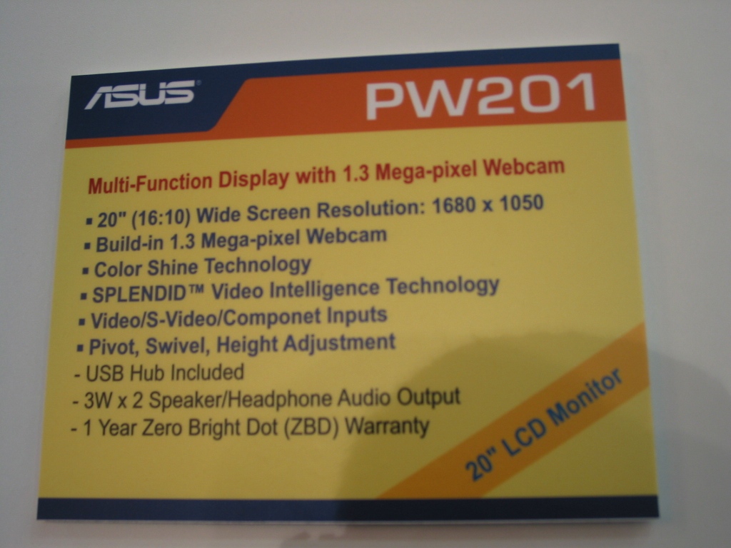 Das etwa zehn Kilogramm schwere Asus PW 201 wird als Entertainment-Display vermarktet und bietet bei einer nativen Auflösung von 1680 x 1050 Pixel eine Bilddiagonale von 20 Zoll. Neben zwei drei-Watt-Lautsprechern verfügt es auch über eine eingebaute 1,3-Megapixel-Kamera. Das Kontrastverhältnis liegt bei 800:1, die maximale Helligkeit bei 350 cd/m². Beim Blickwinkel ist gegenüber dem im Januar vorgestellten PW 191 eine Verbesserung zu verzeichnen, er soll nun in horizontaler und vertikaler Richtung 176 Grad betragen, die Reaktionszeit beträgt aber weiterhin acht Millisekunden. Neben einem D-Sub- bietet der Monitor außerdem je einen DVI-D-, S-Video- und sRGB-Anschluss sowie 4x USB, Audio-In und einen Kopfhörer-Eingang. Sollten innerhalb der ersten drei Monate Pixelfehler auftreten, tauscht Asus das Gerät kostenfrei um.
