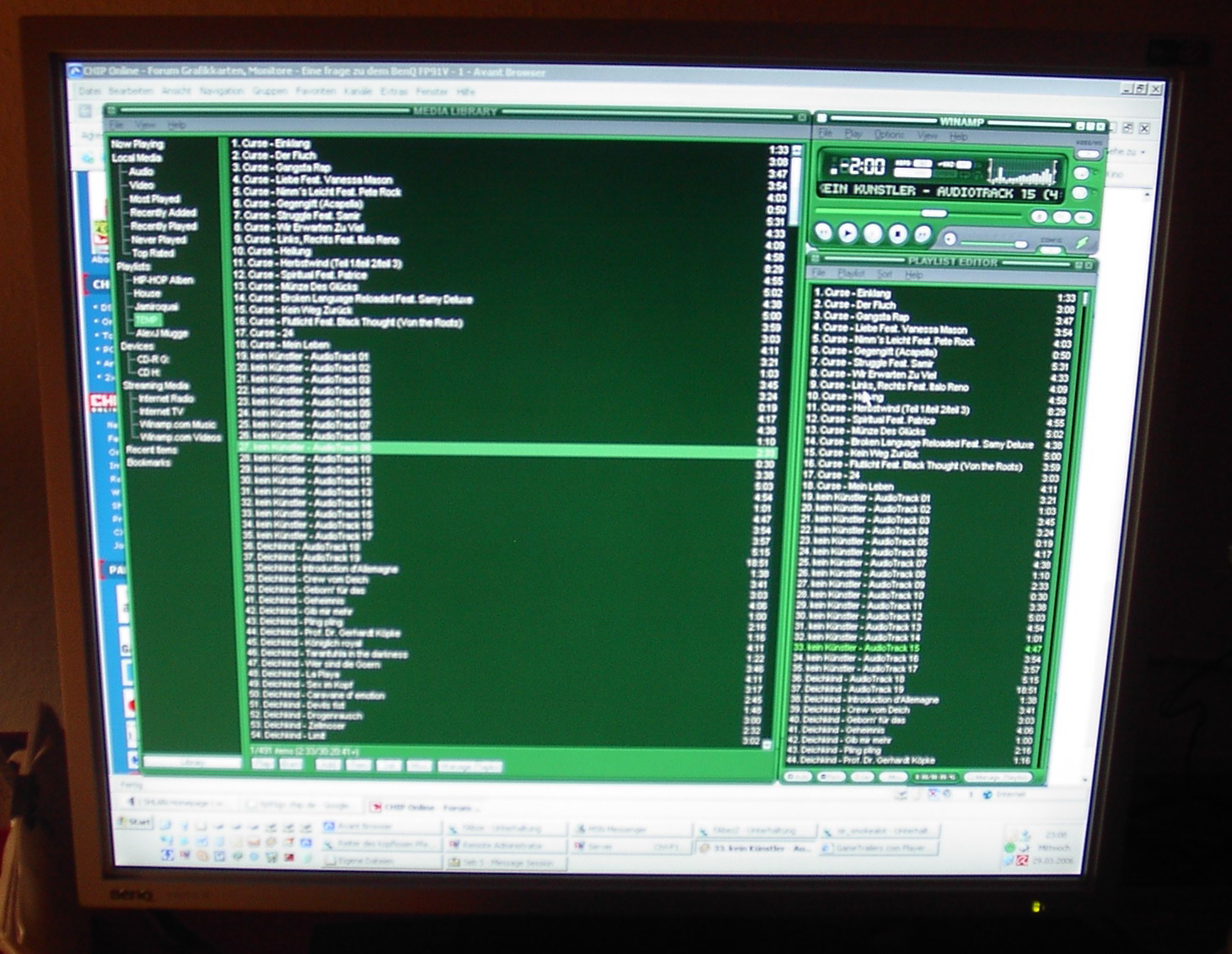 Ich habe meinen Benq FP93GX gestern erhalten und bin direkt mal total enttäuscht von der Ausleuchtung. Wie auch schon von anderen Leuten angemerkt, wird er im oberen Drittel immer dunkler, was aber nur bei bestimmmten, dunklen Farben deutlich sichtbar ist. Bei z. B. dem dunkelgrünen ColorTheme vom Winamp5 ist es sehr extrem, es entsteht ein regelrechter Farbverlauf ins nahezu Schwarze.
