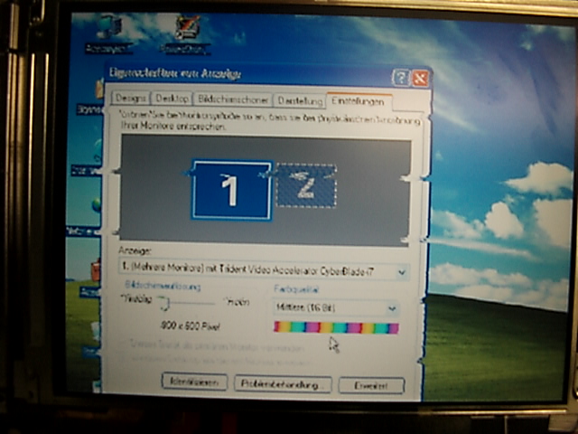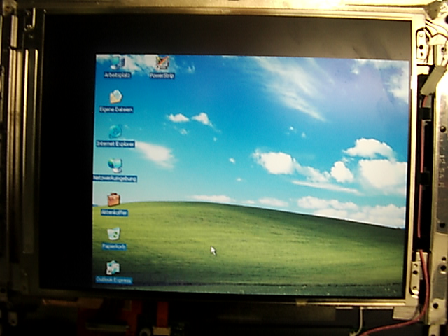 Das Display ist auf eine Aufläsung von 800x600 ausgelegt. Bei einer Einstellung von 800x600x16 Bit ist das Bild zu groß (siehe Bilderanhang 1) und essind jeder Menge starke Zeilenausreißer zu sehen. Diese sind aber nur so stark wenn die Linke Displayhälfte "gefüllt" ist. Auch er Kontrast der Fraben zu einander hat einen Zusammenhang mit der Stärke der Ausreißer. Es gibt bestimmte Farbbedingungen die die Ausreißer verkleinern oder verstärken!