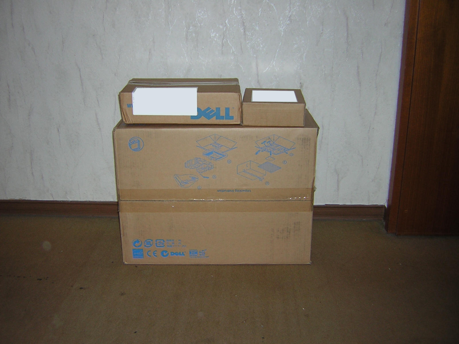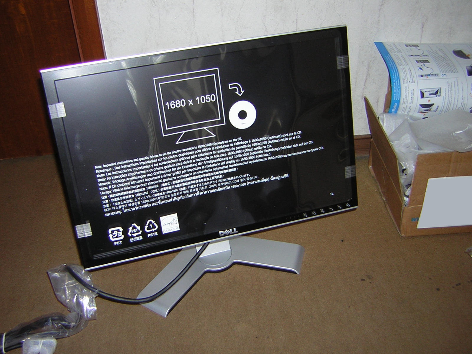 Geliefert wurde 2 Tage nach Ausgang der Ware per UPS. Es waren 3 Pakete, wobei im größten der Monitor mit Standfuß, Treiber CD und Kabeln war, im kleinsten Paket das Stromkabel und mit mittelgroßen – eine einsame Bedienungsanleitung. Als hätte die nicht auch noch in den großen Karton gepasst.