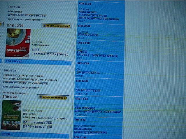 Das erste sind die Streifen (siehe Bild) passiert beim hochfahren von Windows XP (seit zwei Tagen, bei Ubuntustart noch nie bisher). Die zappeln schön auf dem Bild. Mach den Monitor aus und sofort wieder an, sind sie weg und erst ein Windowsneustart bringt sie mir wieder.