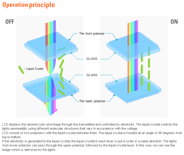 Bei einem TFT-TV (TFT steht für Thin Film Transistor) besteht das sogenannte Panel aus zwei Scheiben zwischen denen in einer Flüssigkeit die Flüssigkristalle eingebettet sind. Zwischen oder außen an den beiden Scheiben sind ebenfalls Polarisations- und Farbfilter zu finden. Die Flüssigkristalle sind in zwei Ausrichtungsebenen angeordnet (Alignment Layer). Um die Ausrichtung der Flüssigkeitskristalle zu ändern, wird mittels der Dünn-Film-Transistoren an die Ausrichtungsebenen eine Spannung angelegt. So entsteht ein elektrisches Feld, was die Flüssigkristalle ausrichtet.