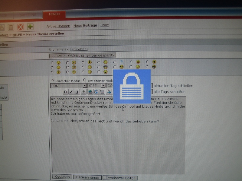 Ich habe seit einigen Tagen das Problem, dass ich bei meinem Dell E228WFP nicht mehr ins OnScreenDisplay reinkomme. Egal welchen der Funktionsknöpfe ich drücke, es erscheint ein weißes Schloss-Symbol auf blaues Hintergrund in der Mitte des Bildschirm.