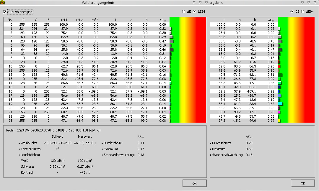 Und im Anhang mal noch Validierung nach Kalibration mit BasICColor Display4 (ich benutze allerdings nur Eizos eigene Software Color Navigator 5.1 ... ist beim CG241W dabei bzw. gibt's als freien Download bei Eizo).