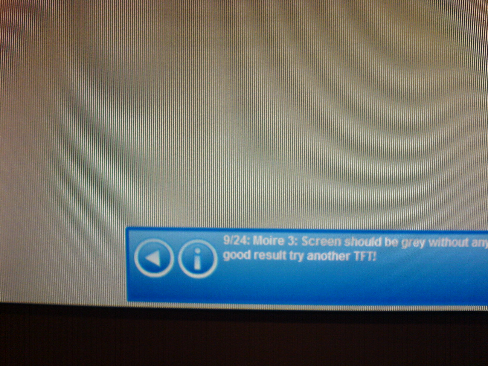 Bei den Testbilder, die mit Moire bezeichnet werden (es gibt davon drei Stück), werden nur die Hälfte aller Pixel dargestellt. Ich sehe beispielsweise immer abwechselnd Schwarz & Grau. (siehe unten)