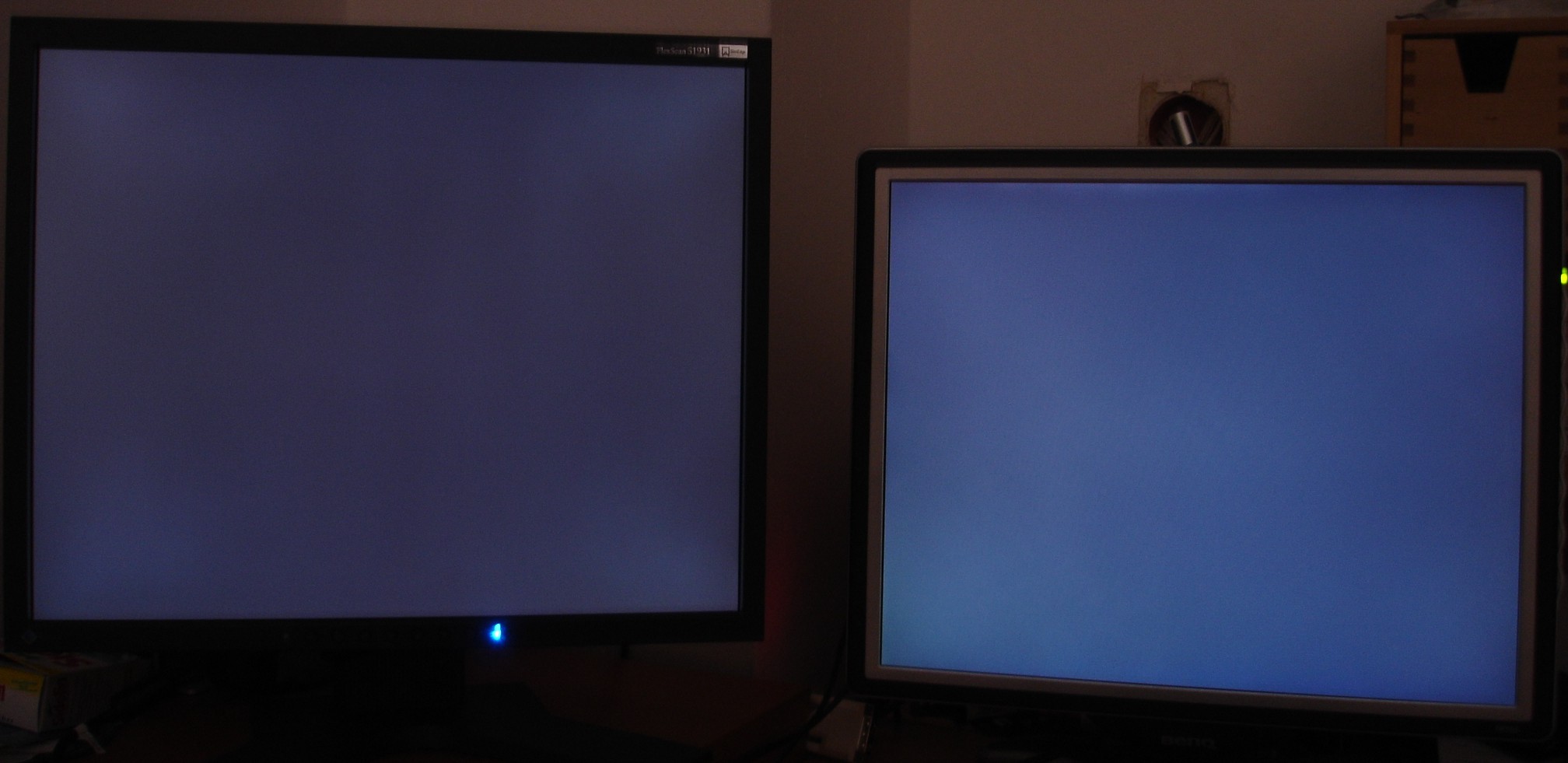 Ausleuchtung: Wie schon mehrfach erwähnt: Das Schwarz ist Schwarz. Gleichmäßiger gehts auch kaum. Ich habe mal mein Zimmer verdunkelt so gut es geht (das ist nicht besonders dunkel!!!) und ein Foto mit langer Belichtungszeit gemacht. Das hängt an. Man kann beim Eizo in den vier Ecken leichte Lichthöfe erkennen aber die sieht man überhaupt nicht wenn man davor sitzt (Man kann auch sehr schön den Helligkeitsunterschied bei Schwarzem Bildschirm zum BenQ erkennen).