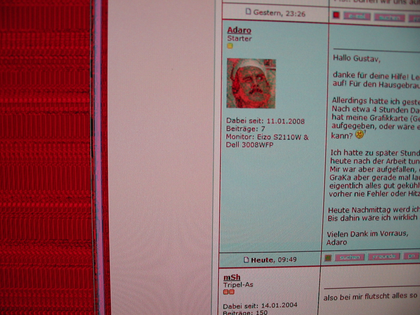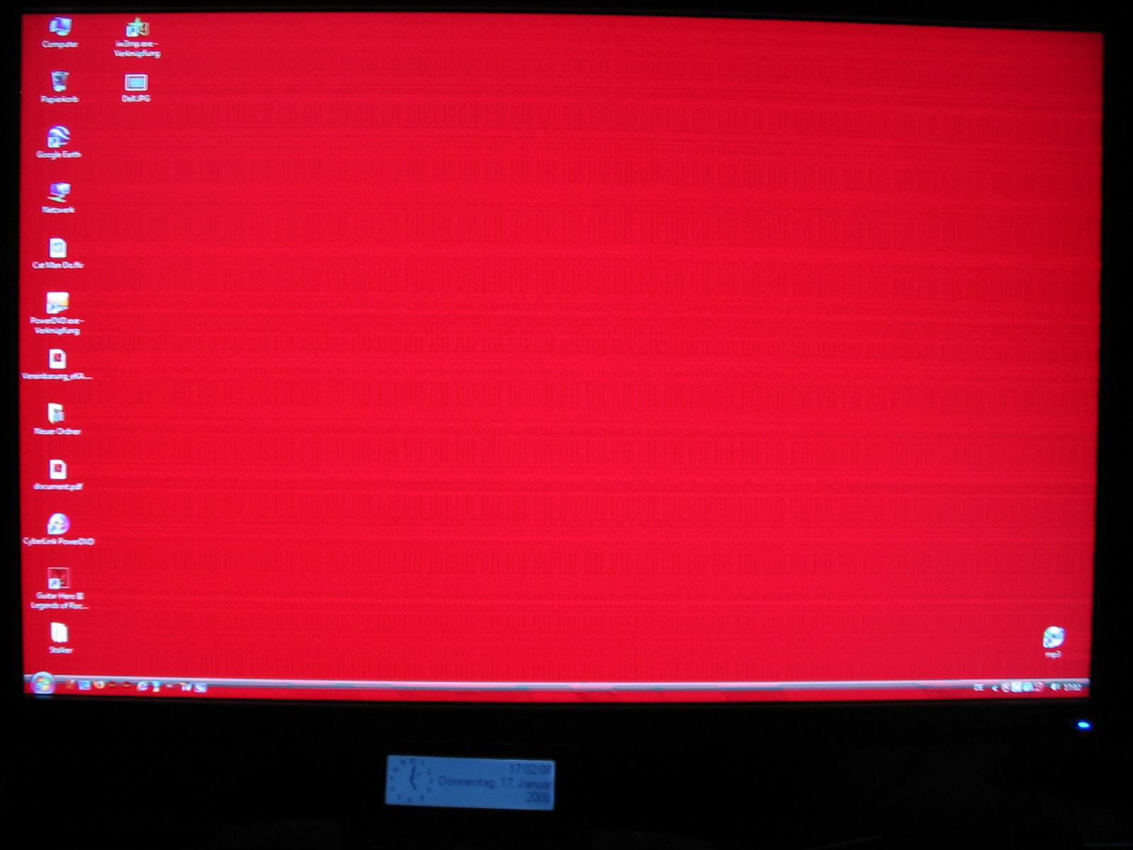Nach 2-3 Stunden "Aufwärmphase" gings auf dem Dell wieder mit ersten kurzen Bildstörungen los. Auf dem Eizo bleibt derweil alles, wie es sein sollte. Wenige Minuten später war dann schon der ganze 3008er knallrot. Auffällig ist, dass schwarze bzw. dunkle Stellen viel stärker betroffen sind, als helle. Die Temperatur an der Oberkante ist zu diesem Zeitpunkt schon fast nicht mehr als warm zu bezeichnen. Vor allem über dem Dell-Logo auf der Rückseite ist das Ding richtig heiss (Mir fehlt leider ein vernünftiges Thermometer, um genau zu messen). Vielleicht ist das bei TFTs in der Größe normal, hab leider keinen Vergleich. Der 21-Zoller bleibt jedenfalls lauwarm und störungsfrei.